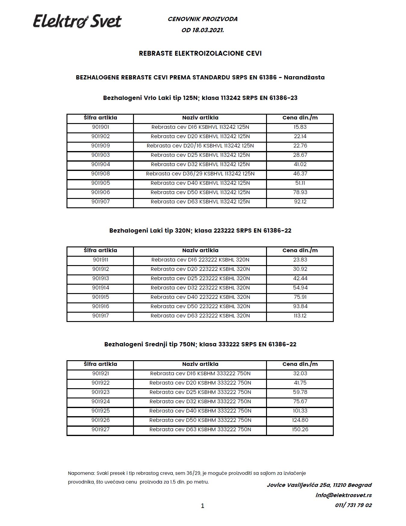 Cenovnik proizvoda Elektro-Svet od 18.03.2021